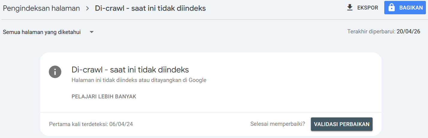 Jika jumlahnya sedikit, biasanya tidak masalah. Namun, jika sebagian besar halaman situs Anda berstatus crawled - currently not indexed, ini adalah sinyal kuat bahwa situs Anda memiliki masalah kualitas konten yang serius di mata Google.